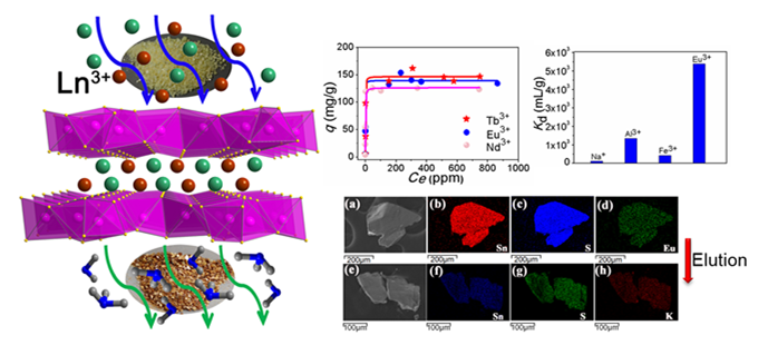 中国科学院福建物质结构研究所结构化学国家重点实验室研究员黄小荥领导的课题组在“973”计划、国家自然科学基金项目和研究员冯美玲主持的国家自然科学基金面上项目、中科院海西研究院“春苗”人才专项等项目的资助下,与美国西北大学化学系Prof. Mercouri G. Kanatzidis合作,利用S2-对稀土离子的亲和力和金属硫化物的柔性开放骨架,创新性地首次将金属硫化物离子交换材料应用于稀土离子的富集和回收。结果表明[Me2NH2]4/3[Me3NH]2/3Sn3S7·1.25H2O(FJSM-SnS)对稀土离子具有高效的富集能力,优点如下:(i)快的离子交换响应速度(<5min);(ii)高的吸附量(Eu3+:139.82 mg/g、Tb3+:147.05 mg/g、Nd3+:126.70 mg/g);(iii)在高浓度的Al3+、Fe3+存在下对稀土离子具有高的选择性;(iv)在模拟离子交换柱实验中对Ln3+去除率高达99.0%;(v)吸附稀土元素后高效、便捷的洗脱能力。该研究开创了金属硫化物基离子交换材料应用于富集和回收水环境中稀土元素的研究。相关研究结果发表在《美国化学会志》上(J. Am. Chem. Soc. 2017, 139, 4314-4317)。该工作第一作者是研究生戚兴辉和杜克钊。