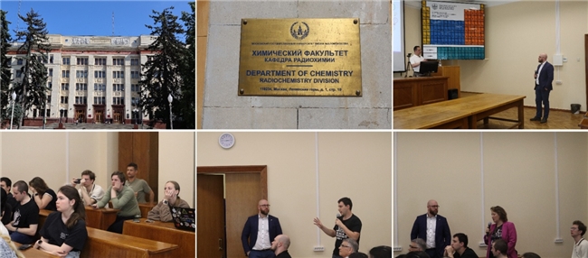 访问伊始,晏敏皓研究员应俄罗斯国家科学院副院长、莫斯科国立大学化学系主任Kalmykov Stepan Nikolaevich院士、莫斯科国立大学剂量和环境放射性实验室主任Vladimir Petrov教授之邀,在该校放射化学教学楼做了两场专题学术报告。报告采用“线下主会场+线上直播”的形式,面向放射化学系师生及研究人员。报告系统展示了团队在放射性废物安全处置、高选择性放射性同位素分离材料等领域的创新性研究成果。在提问交流环节,中俄学者围绕“高选择性吸附剂设计原理”、“核废料处理工程安全性”等前沿议题进行了深入探讨,并就技术路径的异同点、跨学科协同的可能性等交换了建设性意见,现场学术氛围专注而活跃。