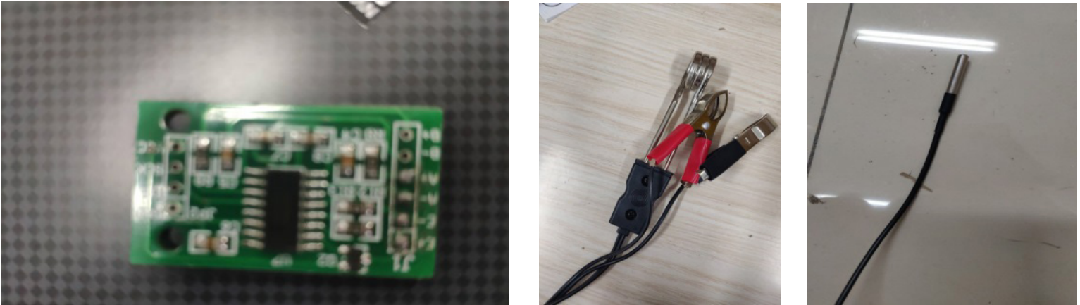 采用重力传感器来检测出的食物量,液位传感器来检测出水量,温度传感器检测水温,加热棒来对水进行加热。其中,图2从左到右依次是重力传感器、加热棒、温度传感器。