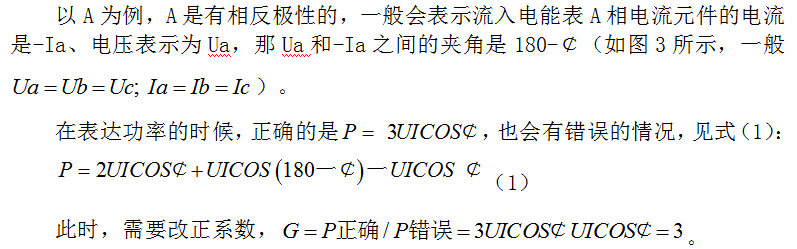 电流表的同相也需要检查,要考虑有没有与电压或者电流回路连接。有一个错误的方法是需要避免的,就是其中的B相元件如果在和2点的A型电压引接线相连的情况下仍与电流的4点相连接,压导线头也是有变化的,具体是2点和5点进行了交换。这种错误的情况发生之后,电能表不能正常工作。此时,电表有两个元件,其中第一元件的电压表示为Ub,电流表示为Ia,其之间的角度是120-¢,;而第二元件的电压和电流分别表示为为Ua和Ib,角度为120+¢。这时会有一个错误的功率公式,见式(2):